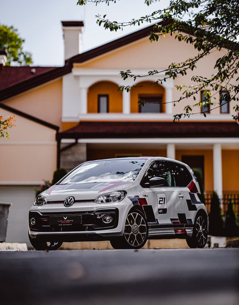 Болгарский тюнер начал свою работу с анализа проделанных модификаций от Milltek и переосмыслил их, подготовив для Volkswagen Up! GTI новую ливрею кузова, объединяющую в себе чёрную, серую и красную графику на белой основе, а ещё добавив цифру 21, имеющую большое значение для владельца.