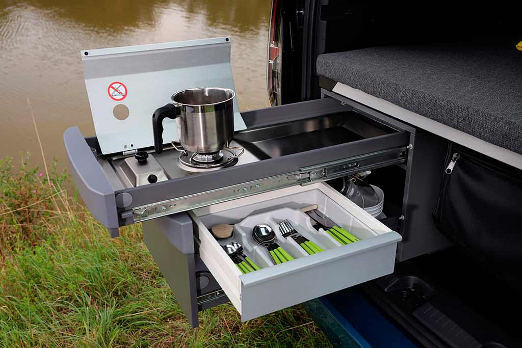 Мини-кухня VW Caddy California состоит из двух выдвижных компонентов, включая верхнюю столешницу с газовой варочной панелью и ветрозащитным экраном. В нижней части находится поддон для столовых приборов, а также место для хранения других кухонных принадлежностей и небольшого запаса продуктов.