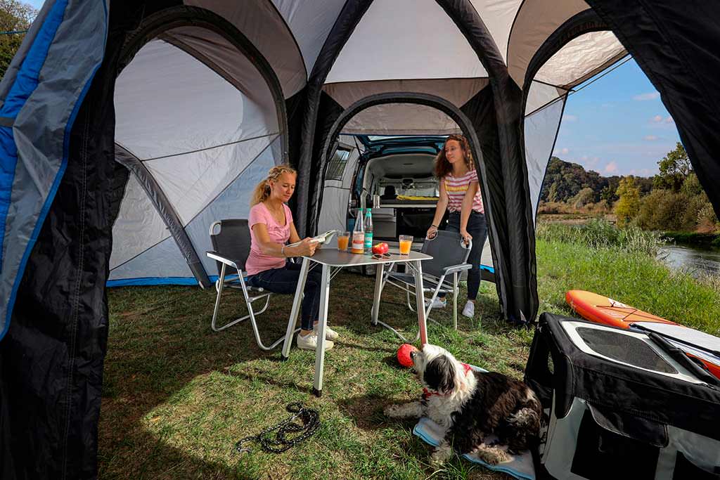 Говоря о пространстве, в Caddy California предусмотрено несколько сумок на молнии, закрепляемых по бокам, каждая вместимостью 5 кг. Поскольку Caddy не является достаточно вместительным выбором для семейных путешествий в составе нескольких человек, в его комплектацию входит специально разработанная модульная палатка Volkswagen, которая подсоединяется к кузову фургона и существенно увеличивает его внутреннюю жилую ячейку. Это обеспечивает маленький автофургон двумя спальными местами в салоне и еще двумя – в палатке.