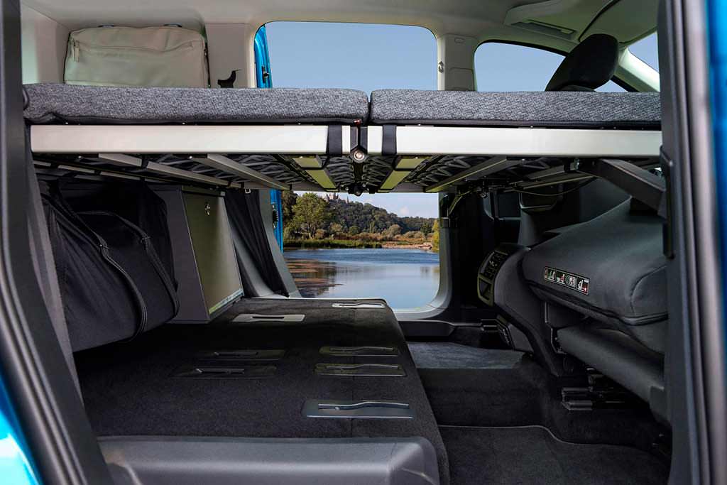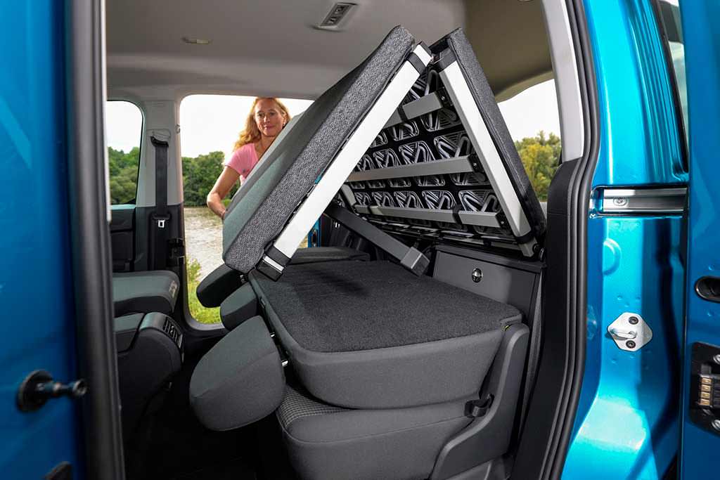 Хотя снаружи Volkswagen Caddy California выглядит как обычный фургон, внутри он скрывает множество улучшений для кемпинга. Одно из самых примечательных улучшений – новая раскладная кровать с качественным удобным матрасом. Она складывается в багажнике, а когда разложена, то оставляет место под днищем для хранения двух стульев и походного стола.
