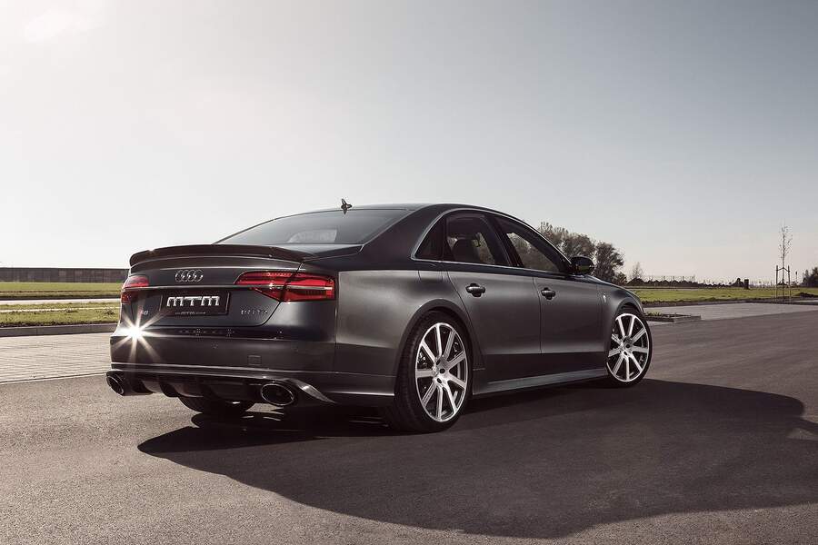До второй сотни спортивный седан разгоняется за 10,51-секунды. Максимальная планка Audi S8 в мастерской MTM установлена на отметке 325 км/ч (у ABT на 290 км/ч). Причём спецы MTM уверяют, что установив на седан особые гоночные покрышки, его без проблем можно разогнать до 350 км/ч. В состав нового пакета апгрейда для Audi S8 входят высокопроизводительные турбины, перепрограммированный ЭБУ двигателем и спортивная выхлопная система. Этот набор стоит €35 000. Отдельно предлагается фирменная пневмоподвеска собственной разработки MTM за €2 200, карбоновый аэродинамический обвес кузова за €15 000, а также комплект 21-дюймовых колёс Bimoto с «резиной» Michelin Pilot Super Sports за €6 300.