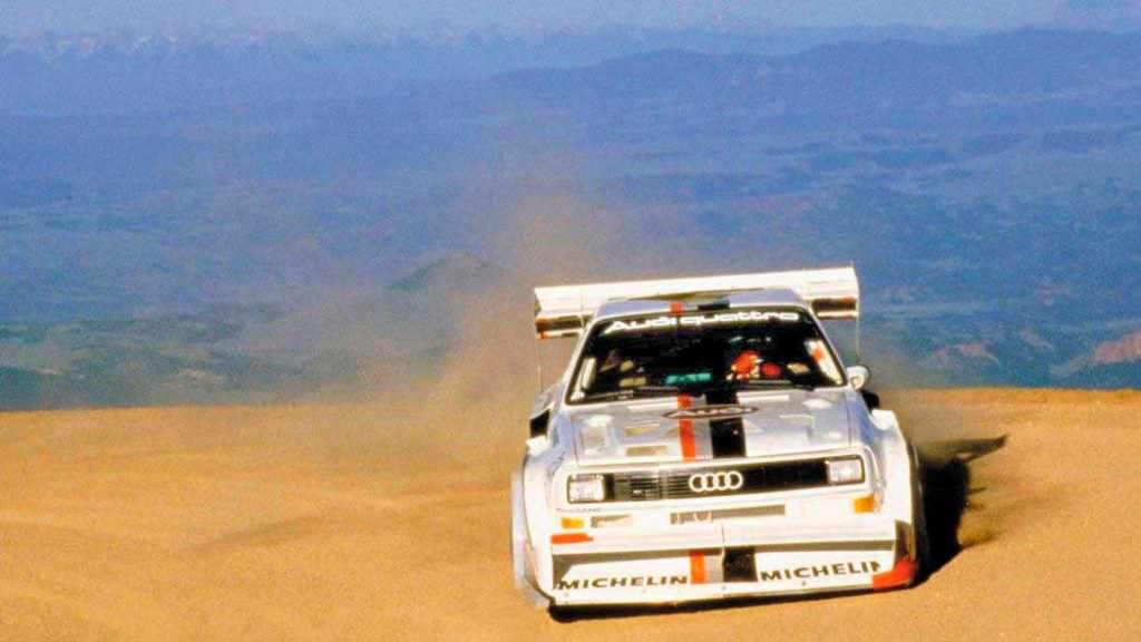 1987 год. Гонка в небо или Pikes Peak Hill Climb. Audi Sport quattro S1 взбирается на вершину горы на отметке 1 435 метров за 10 минут и 47,85-секунд. Полноприводный автомобиль проходит 20 километров и преодолевает 156 поворотов со средней скоростью 196 км/ч.