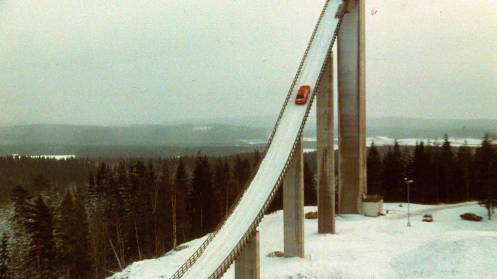 1986 год. Audi 100 CS Quattro взбирается на лыжный трамплин в Фингляндии.