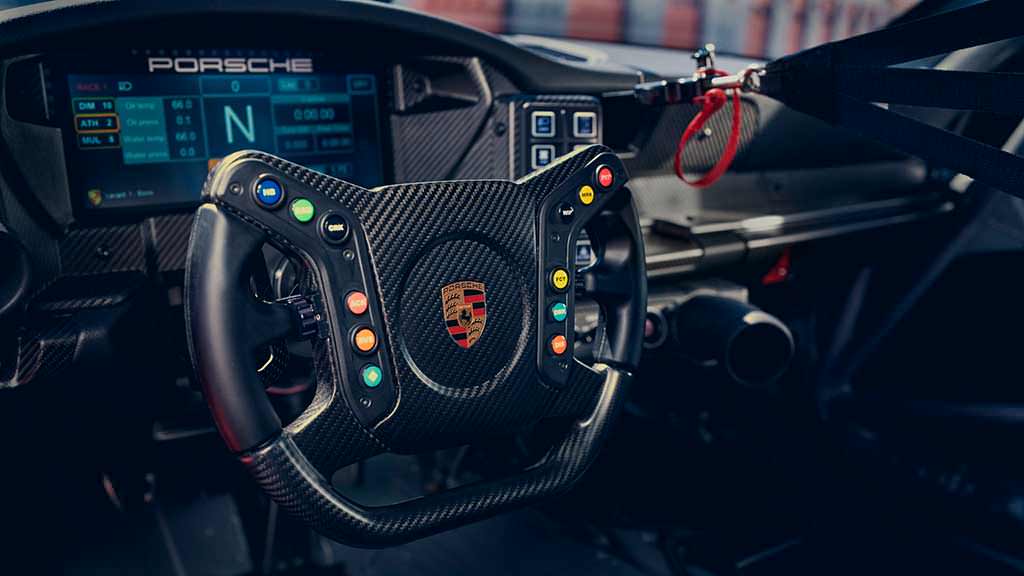 Гоночный руль в салоне Porsche 911 GT3 Cup