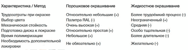 Из таблицы можно сделать вывод: если необходимо быстро, недорого и полностью перекрасить диски, не придираясь к выбору цвета, рекомендуется порошковое окрашивание. Жидкостное окрашивание рекомендуется при тщательном подборе оттенка, или для устранения небольших повреждений — сколов или царапин на лицевой стороне.