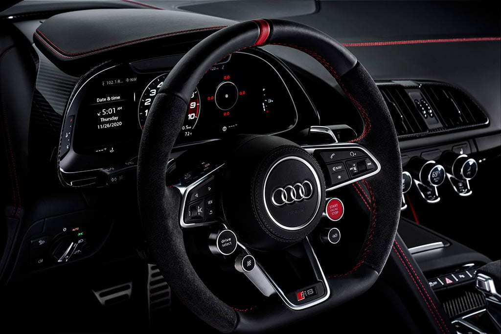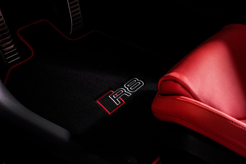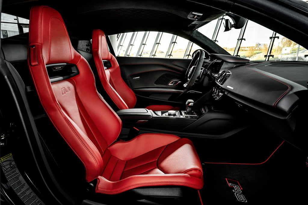 Уникальный стиль Audi R8 Panther Edition продолжается и в салоне, где дизайнеры применили полностью кожаную отделку от Audi Exclusive с малиновой прострочкой. Красная тема повторяется в гоночных сиденьях, обтянутых малиновой кожей Nappa. Также выделяется новый руль в коже / алькантаре, обшивка потолка алькантарой с алмазной вышивкой, специальные коврики с вышивкой R8, а также малиново-красная кожаная окантовка.