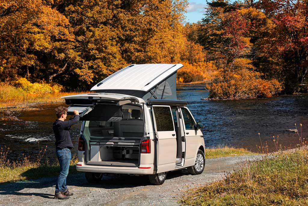 Новый кемпер Volkswagen California Beach 6.1 оснащён умной кухней для возможности полноценной готовки на природе. В отличие от громоздких кухонных блоков в модели California Ocean, новый California Beach получил мини-кухню, которая запакована в обшивку и раскладывается с правой стороны салона, сразу за поворотным сиденьем водителя. Раковины и холодильника в оснащении нет, зато есть газовая плита с одной горелкой и столешница из нержавеющей стали. Откидная крыша с гидроусилителем входит уже в стандартную комплектацию VW California Beach 6.1, поэтому при готовке на кухне внутри фургона, повар может распрямить плечи и стоять ровно.